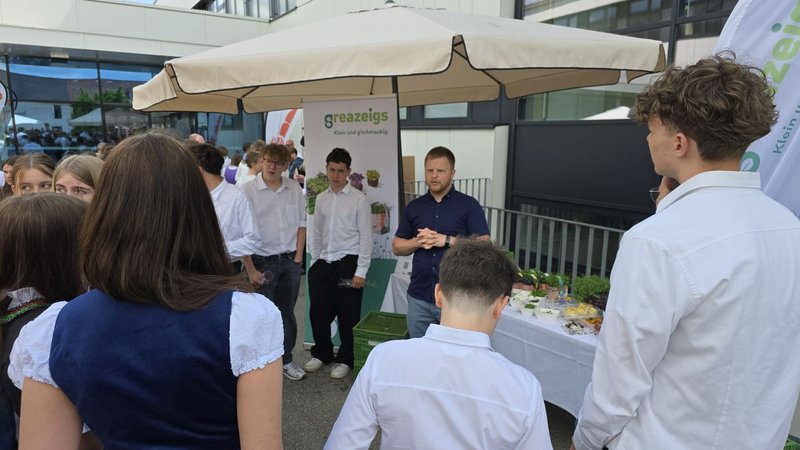 Um den Schüler:innen einen genussvollen Zugang zur handwerklichen Lebensmittelproduktion zu ermöglichen, wurden verschiedene Mitmachstationen angeboten. Dabei konnten sie z.B. beim Buttershaken selbst erleben, wie aus einfachen Rohstoffen hochwertige Lebensmittel entstehen. Auch bei de Genussland Logo Challenge stand handwerkliches Geschick im Vordergrund: Die Klassen gestalteten kreativ das Genussland OÖ Logo – ausschließlich mit regionalen Lebensmitteln. Die schnellste Klasse wurde mit einer Urkunde und einem kleinen Geschenk ausgezeichnet.